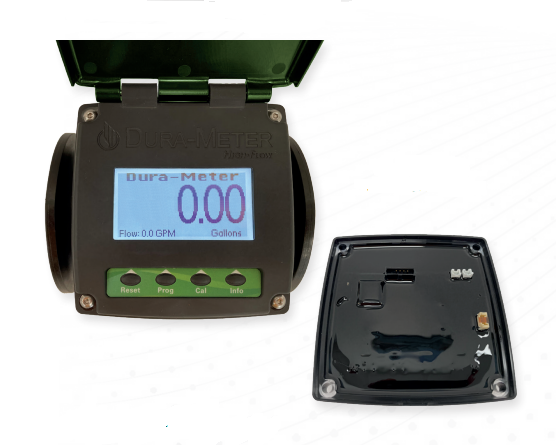 The Dura-Meter displays batch and total volume with gallons or liters flow rate measurement. The fluid flow starts the measurement.